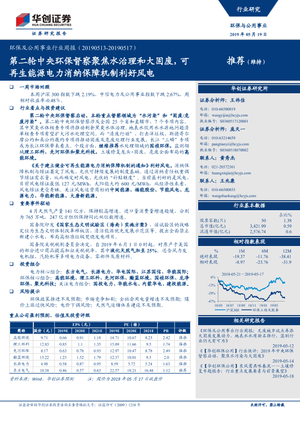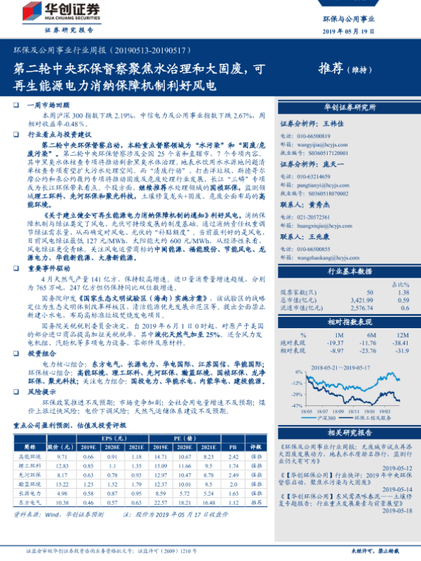 【华创证券】【20190519】环保及公用事业行业周报:第二轮中央环保督察聚焦水治理和大固废,可再生能源电力消纳保障机制利好风电-33页