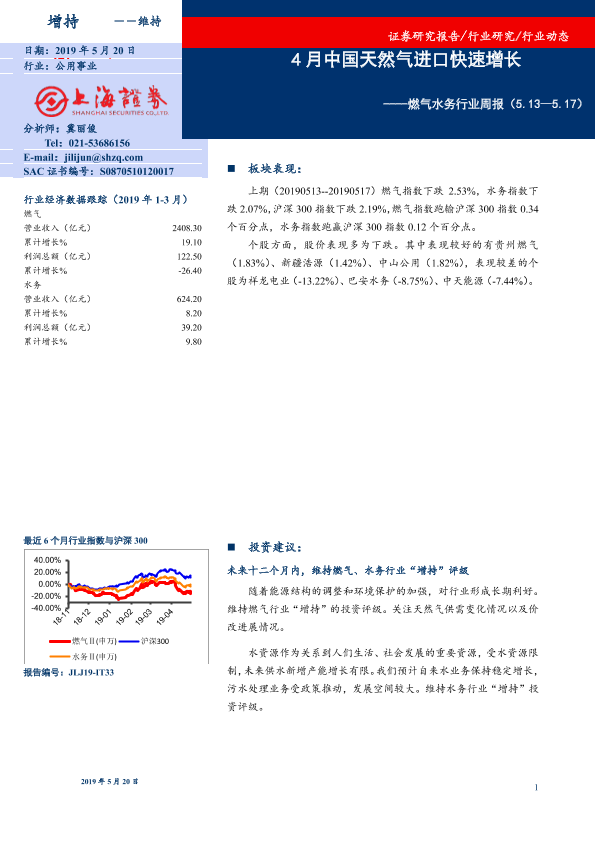 【上海证券】【20190520】燃气水务行业周报:4月中国天然气进口快速增长-6页