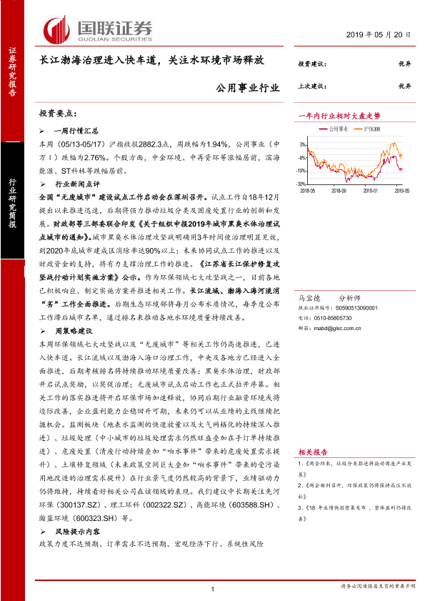 【国联证券】【20190520】公用事业行业研究简报:长江渤海治理进入快车道,关注水环境市场释放-12页