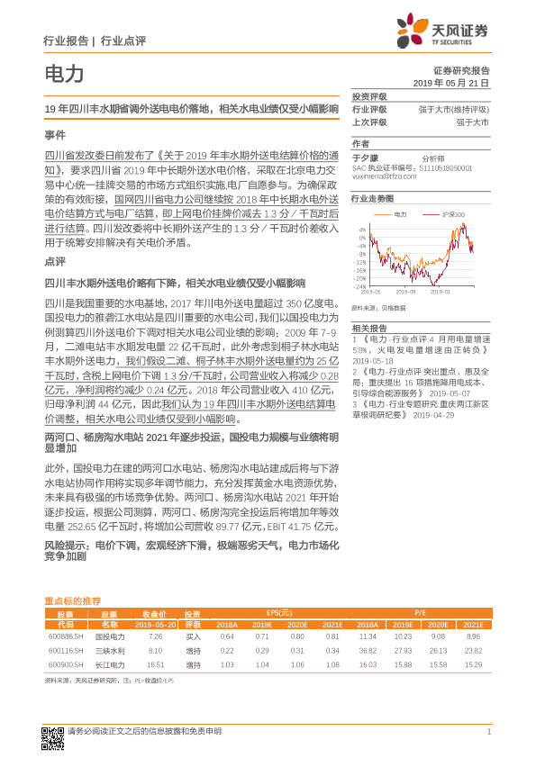 【天风证券】【20190521】19年四川丰水期省调外送电电价落地,相关水电业绩仅受小幅影响-2页