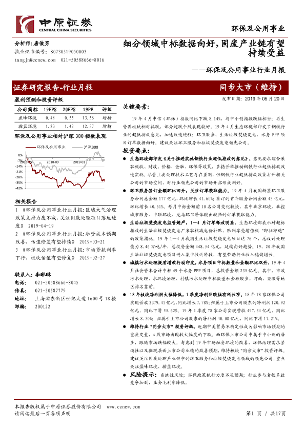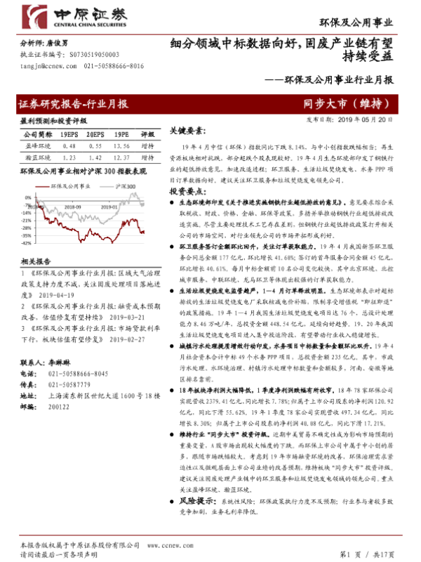【中原证券】【20190520】环保及公用事业行业月报:细分领域中标数据向好,固废产业链有望持续受益-17页