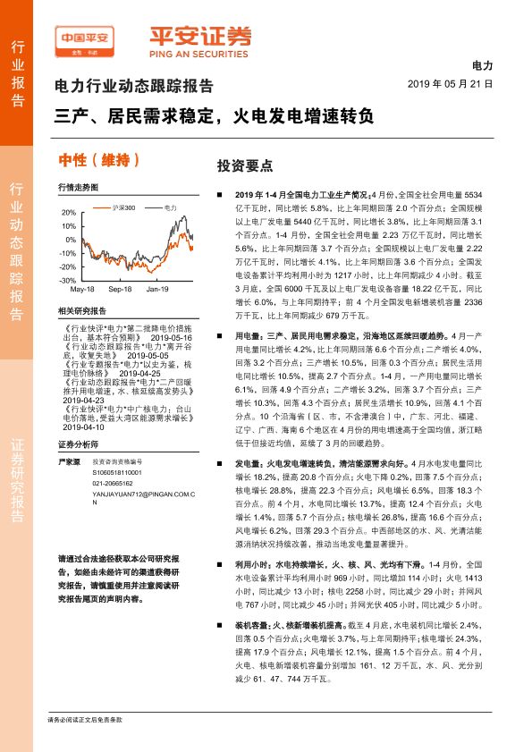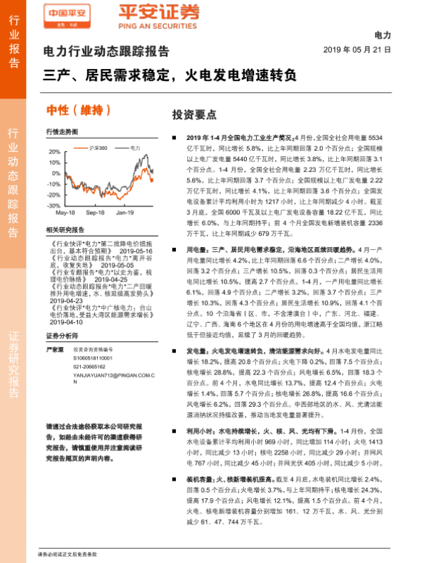 【平安证券】【20190521】电力行业动态跟踪报告:三产、居民需求稳定,火电发电增速转负-15页