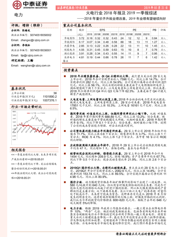 【中泰证券】【20190521】火电行业2018年报及2019一季报综述-20页