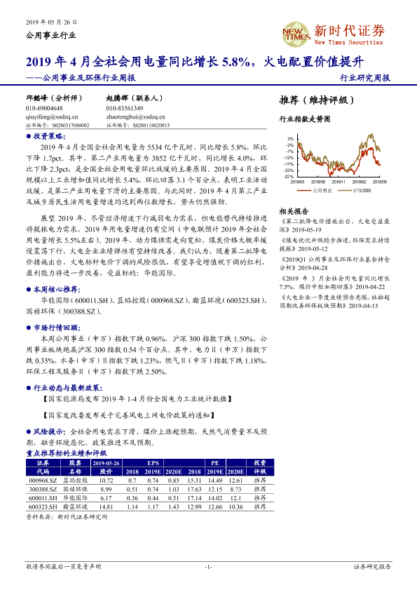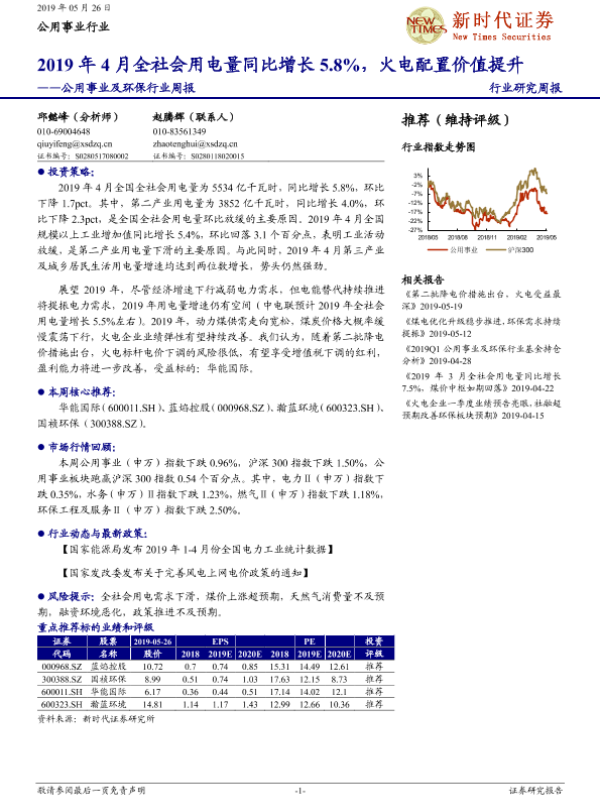 【新时代证券】【20190526】2019年4月全社会用电量同比增长5.8%,火电配置价值提升-12页