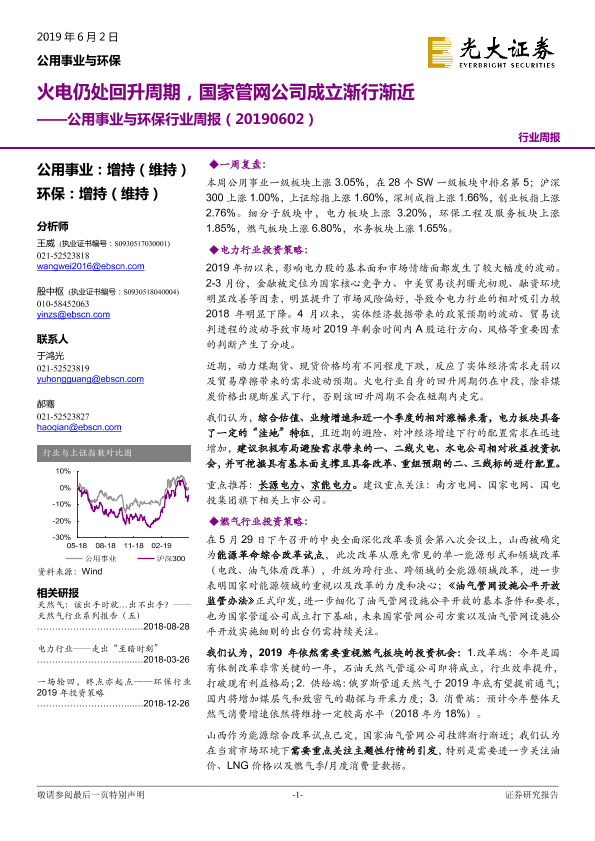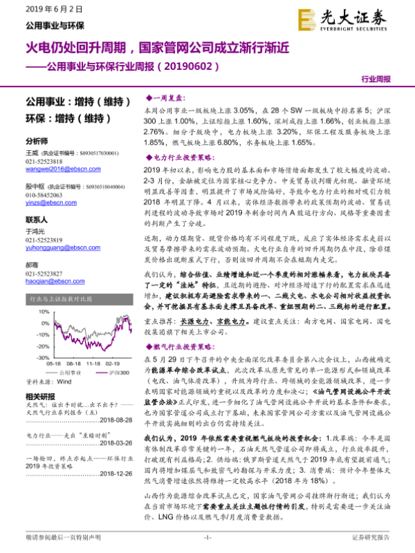 【光大证券】【20190602】公用事业与环保行业周报:火电仍处回升周期,国家管网公司成立渐行渐近-20页