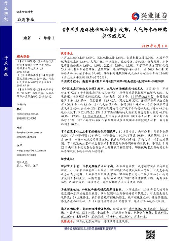 【兴业证券】【20190601】中国生态环境状况公报发布,大气与水治理需求仍然充足-11页