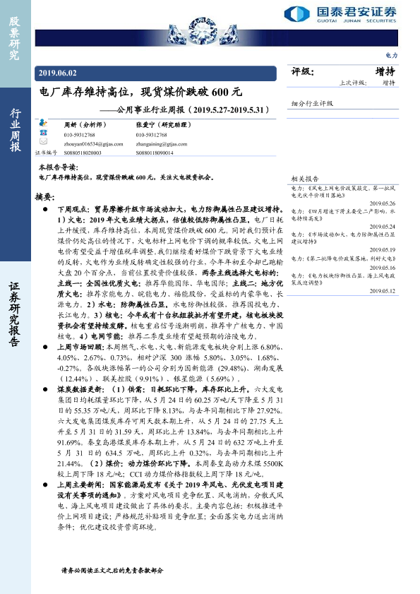 【国泰君安证券】【20190602】电厂库存维持高位,现货煤价跌破600元-13页