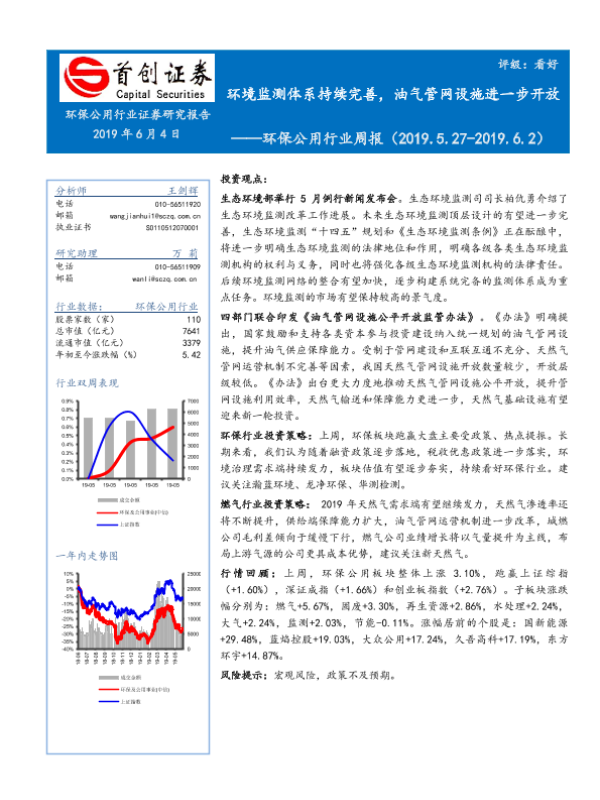 【首创证券】【20190604】环保公用行业周报:环境监测体系持续完善,油气管网设施进一步开放-10页