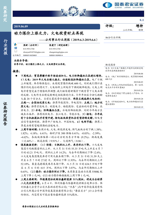 【国泰君安证券】【20190609】公用事业行业周报:动力煤价上涨乏力,火电投资时点再现-13页