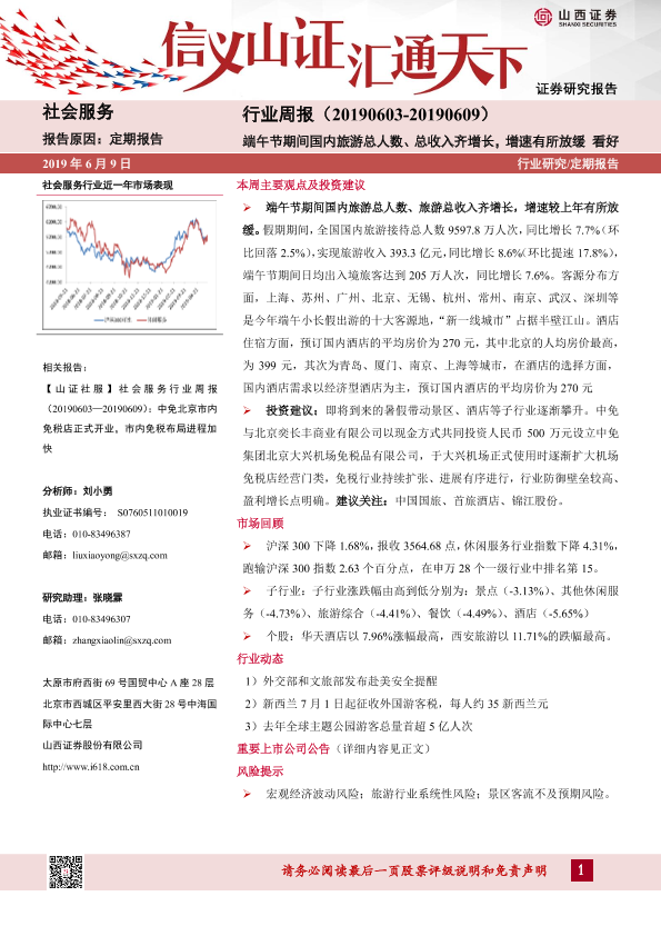 【山西证券】【20190609】社会服务行业周报:端午节期间国内旅游总人数、总收入齐增长,增速有所放缓-9页