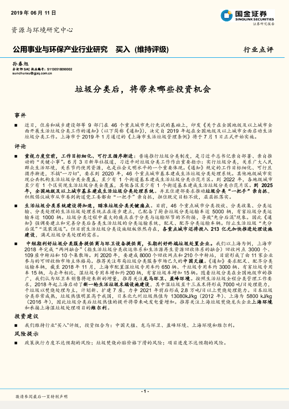 【国金证券】【20190611】公用事业与环保产业行业研究:垃圾分类后,将带来哪些投资机会-3页