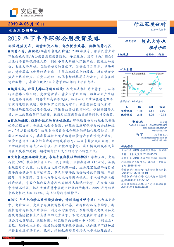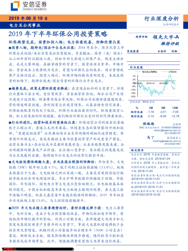 【安信证券】【20190610】2019年下半年环保公用投资策略-环保趋势见底,国资加快入场;电力供需改善,防御优势凸显-42页
