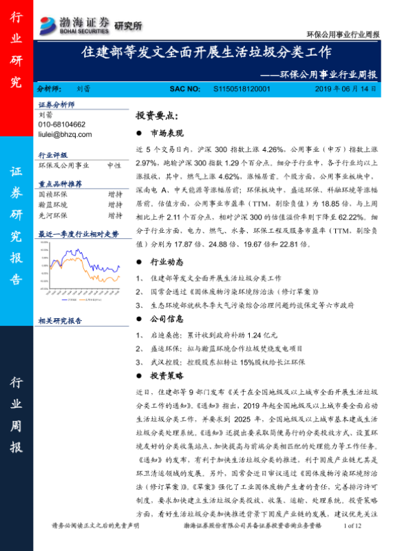 【渤海证券】【20190614】环保公用事业行业周报:住建部等发文全面开展生活垃圾分类工作-12页