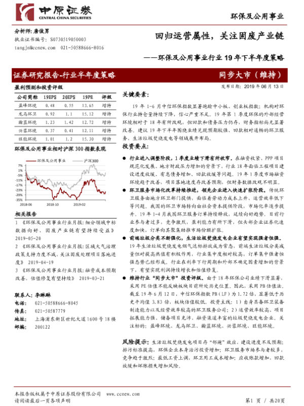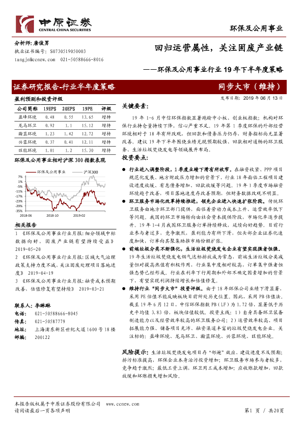 【中原证券】【20190613】环保及公用事业行业19年下半年度策略:回归运营属性,关注固废产业链-20页
