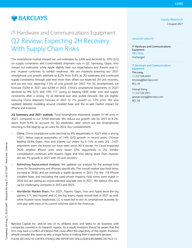 【巴克莱资本】【20210803】美股IT硬件及通讯设备行业-第二季度回顾;预期下半年复苏与供应链风险-21页