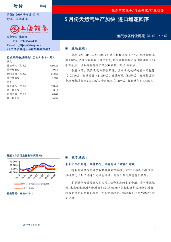 【上海证券】【20190617】燃气水务行业周报:5月份天然气生产加快进口增速回落-7页