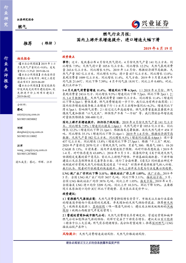 【兴业证券】【20190619】燃气行业月报:国内上游开采增速提升,进口增速大幅下滑-13页