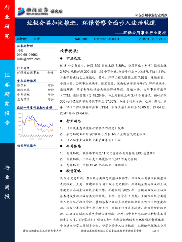【渤海证券】【20190621】环保公用事业行业周报:垃圾分类加快推进,环保督察全面步入法治轨道-13页
