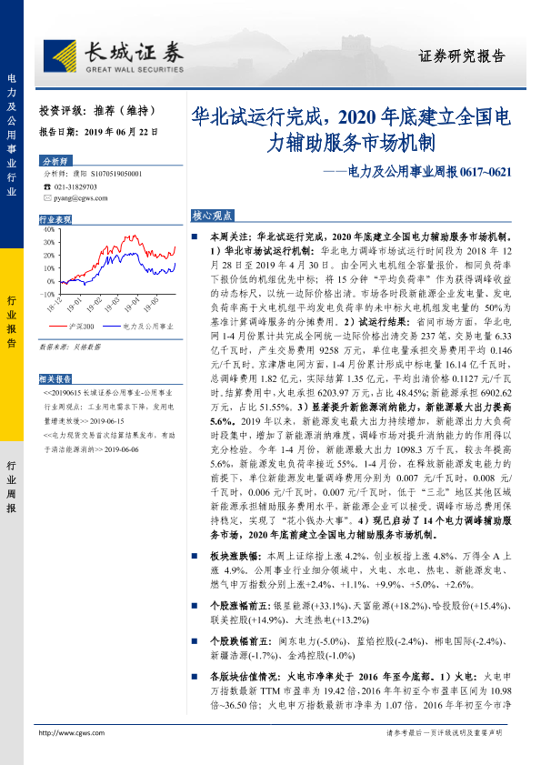 【长城证券】【20190622】电力及公用事业周报:华北试运行完成,2020年底建立全国电力辅助服务市场机制-14页