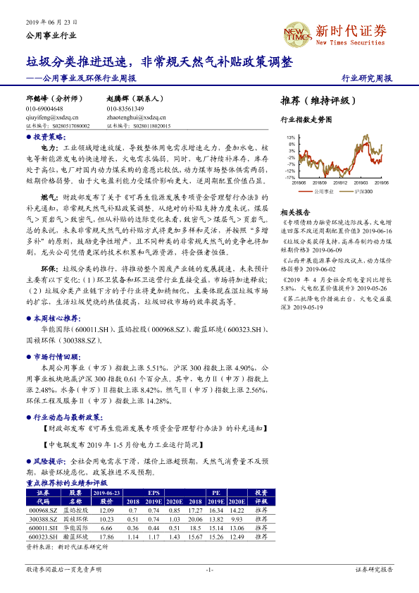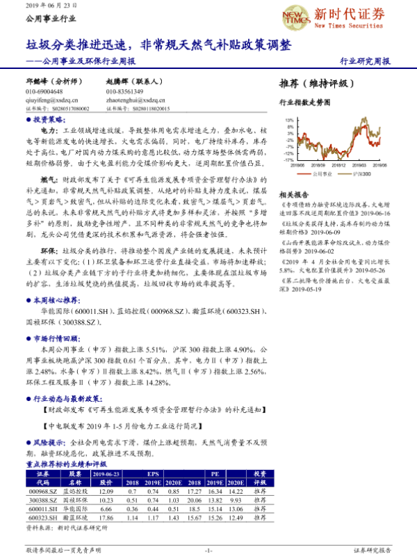 【新时代证券】【20190623】公用事业及环保行业周报:垃圾分类推进迅速,非常规天然气补贴政策调整-13页
