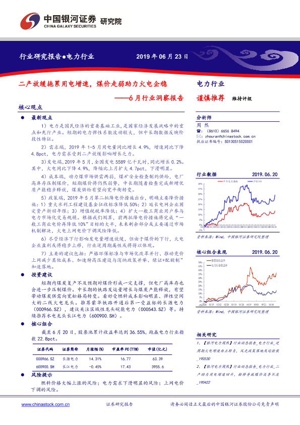 【银河证券】【20190623】6月行业洞察报告:二产放缓拖累用电增速,煤价走弱助力火电企稳-24页