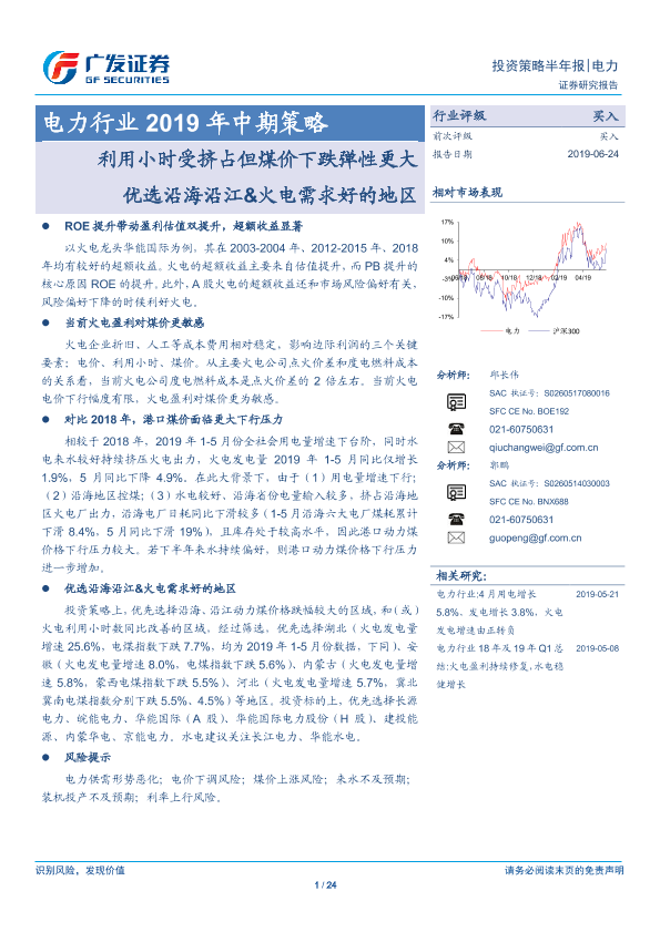 【广发证券】【20190624】电力行业2019年中期策略:利用小时受挤占但煤价下跌弹性更大 优选沿海沿江&火电需求好的地区-24页