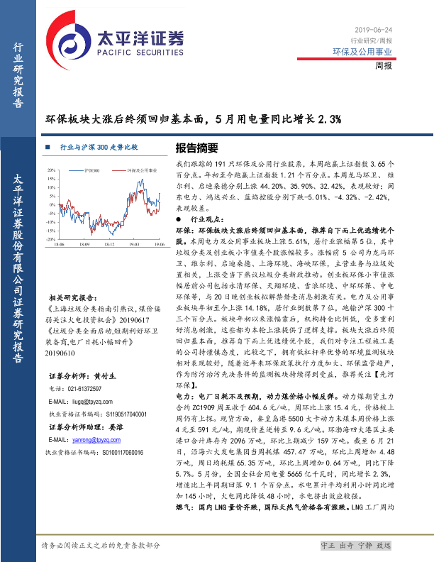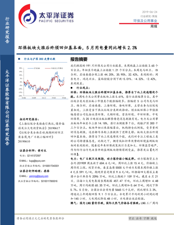 【太平洋证券】【20190624】环保及公用事业周报:环保板块大涨后终须回归基本面,5月用电量同比增长2.3%-18页
