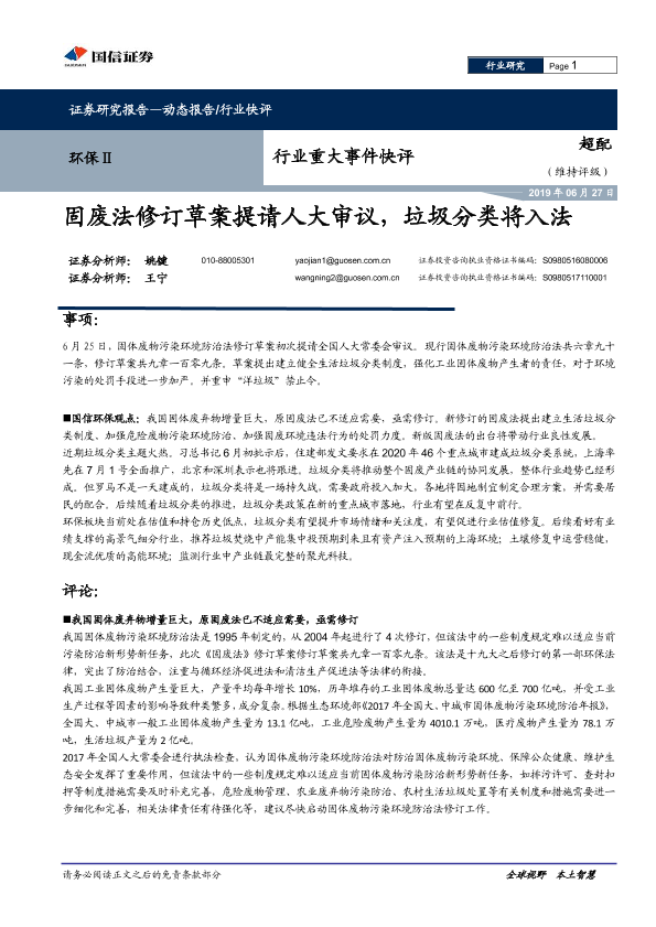 【国信证券】【20190627】环保Ⅱ行业重大事件快评:固废法修订草案提请人大审议,垃圾分类将入法-5页