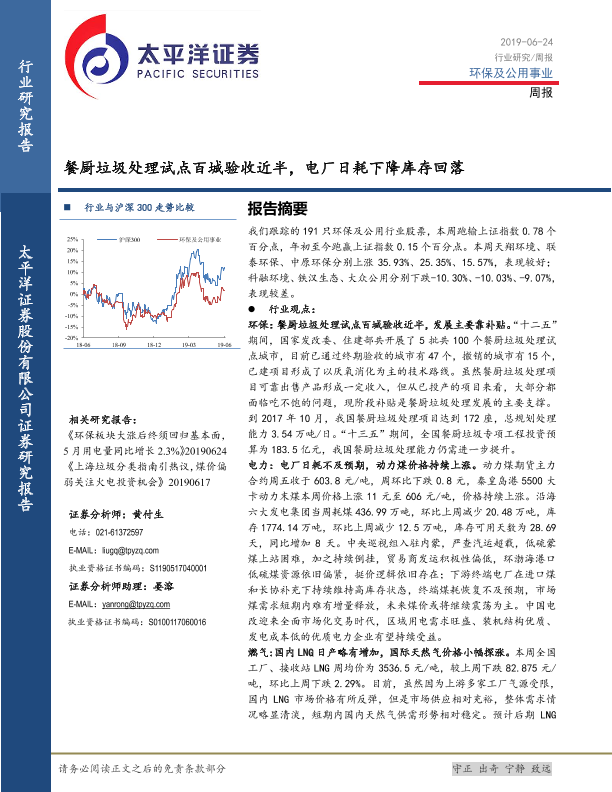【太平洋证券】【20190624】环保及公用事业行业周报:厨垃圾处理试点百城验收近半,电厂日耗下降库存回落-17页