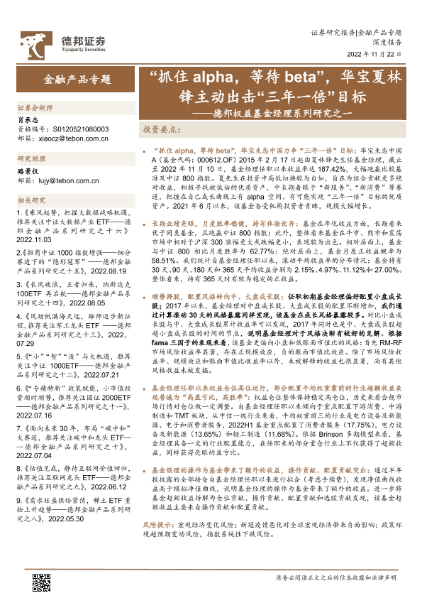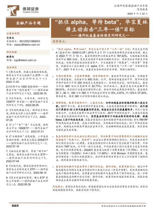 【德邦证券】【20221122】德邦权益基金经理系列研究之一:“抓住alpha,等待beta”,华宝夏林锋主动出击“三年一倍”目标-18页