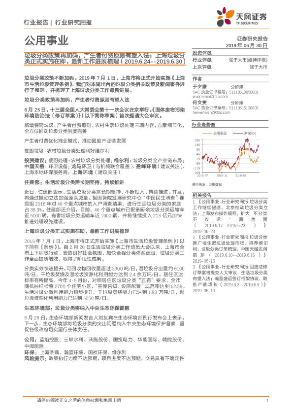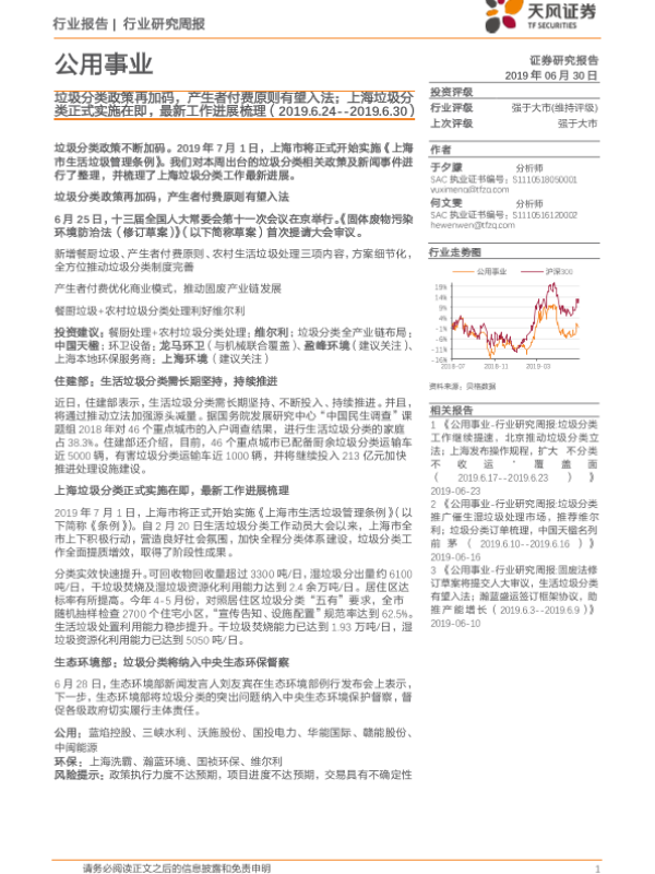 【天风证券】【20190630】公用事业行业研究周报:垃圾分类政策再加码,产生者付费原则有望入法;上海垃圾分类正式实施在即,最新工作进展梳理-12页