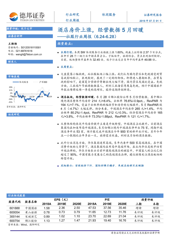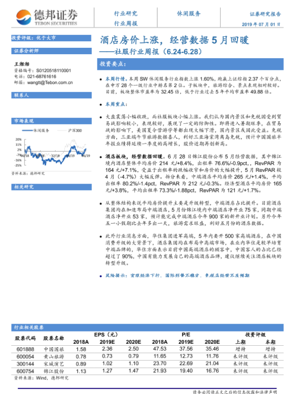 【德邦证券】【20190701】社服行业周报:酒店房价上涨,经营数据5月回暖-7页