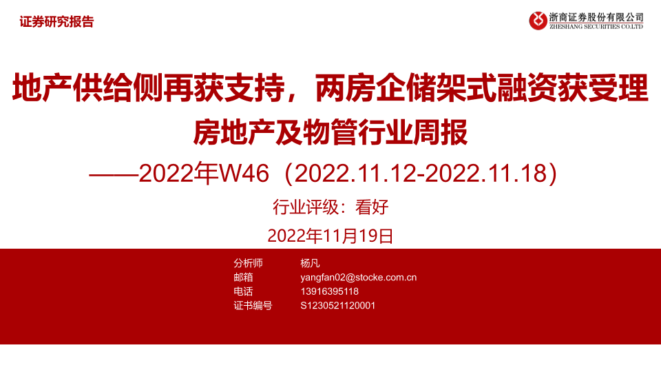 【浙商证券】【20221119】房地产及物管行业周报2022年W46:地产供给侧再获支持,两房企储架式融资获受理-33页