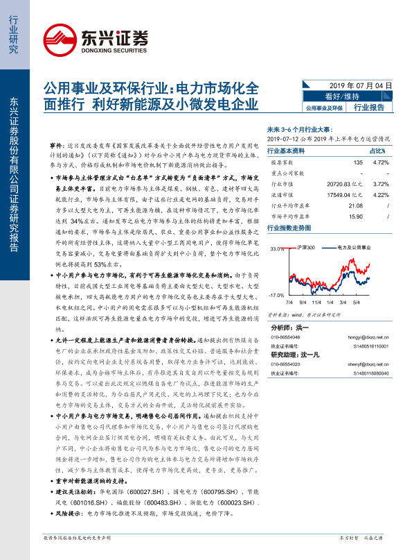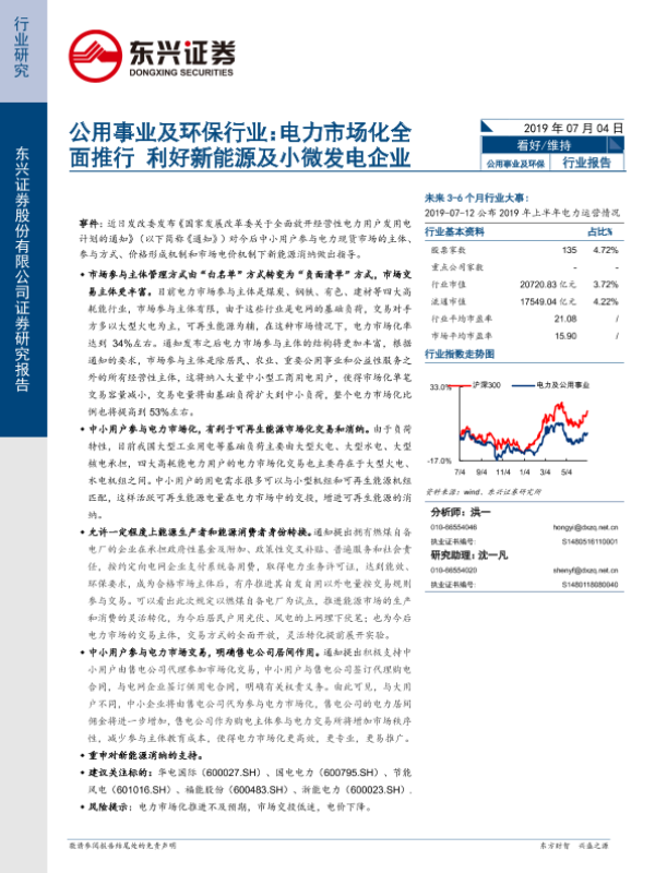【东兴证券】【20190704】公用事业及环保行业:电力市场化全面推行利好新能源及小微发电企业-3页