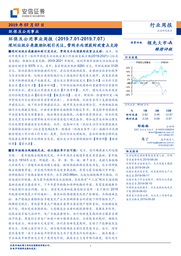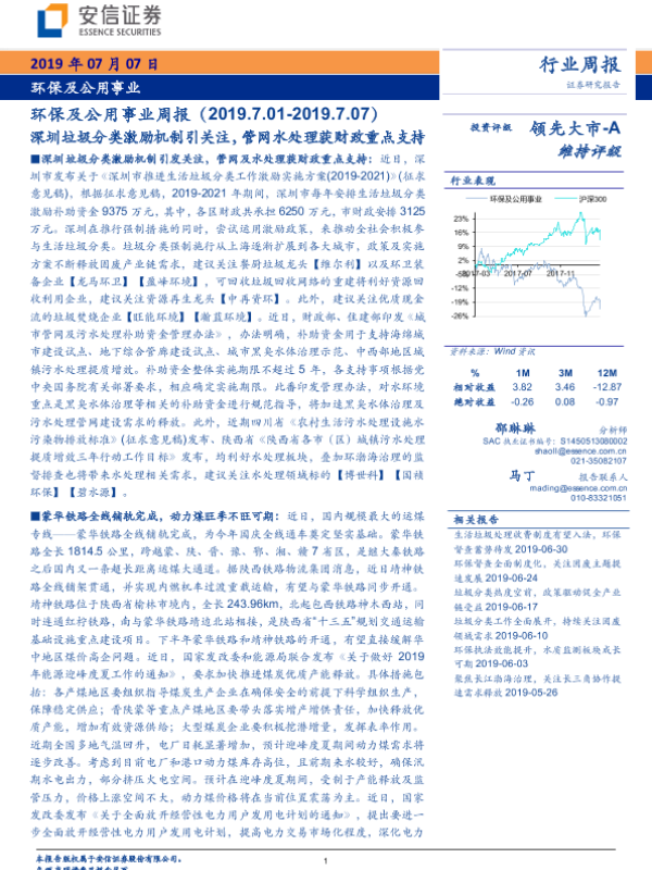 【安信证券】【20190707】环保及公用事业周报:深圳垃圾分类激励机制引关注,管网水处理获财政重点支持-18页