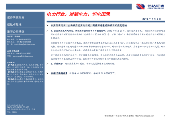 【信达证券】【20190708】电力行业:浙能电力、华电国际-5页