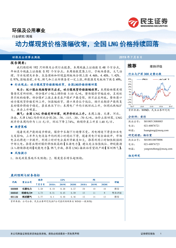 【民生证券】【20190708】环保及公用事业周报:动力煤现货价格涨幅收窄,全国LNG价格持续回落-12页
