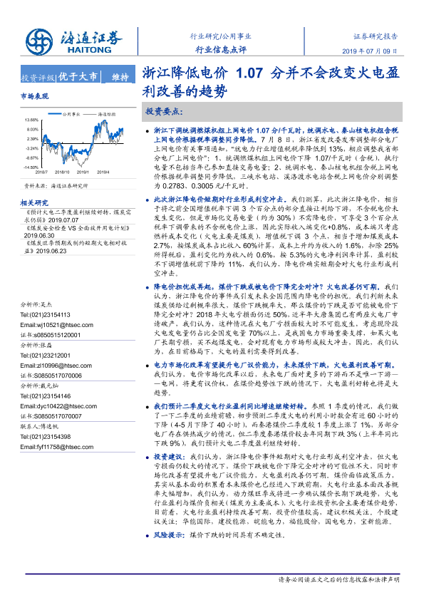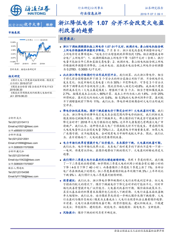 【海通证券】【20190709】浙江降低电价1.07分并不会改变火电盈利改善的趋势-2页