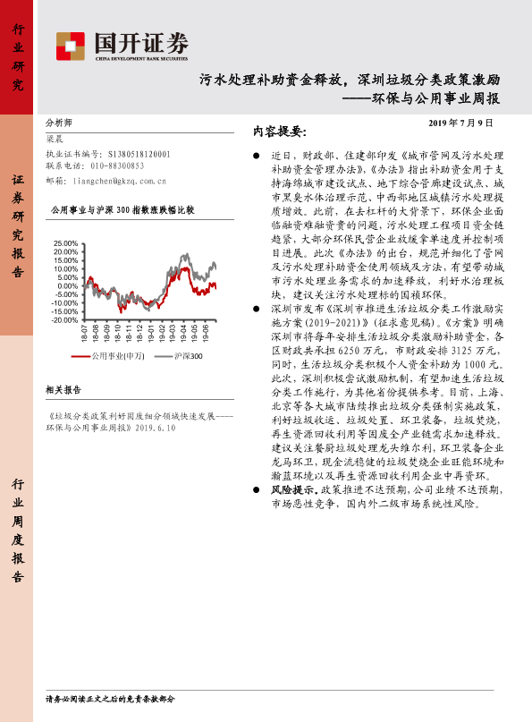 【国开证券】【20190709】环保与公用事业周报:污水处理补助资金释放,深圳垃圾分类政策激励-8页