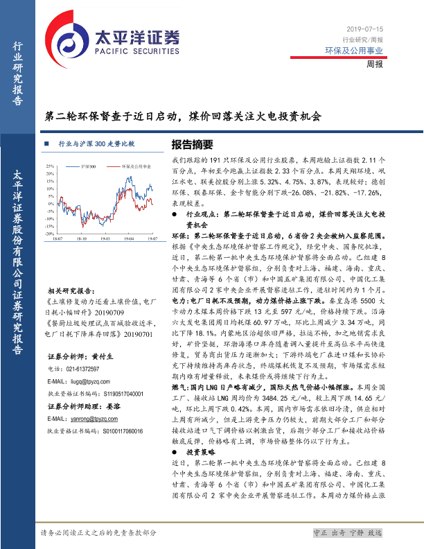 【太平洋证券】【20190715】第二轮环保督查于近日启动,煤价回落关注火电投资机会-18页