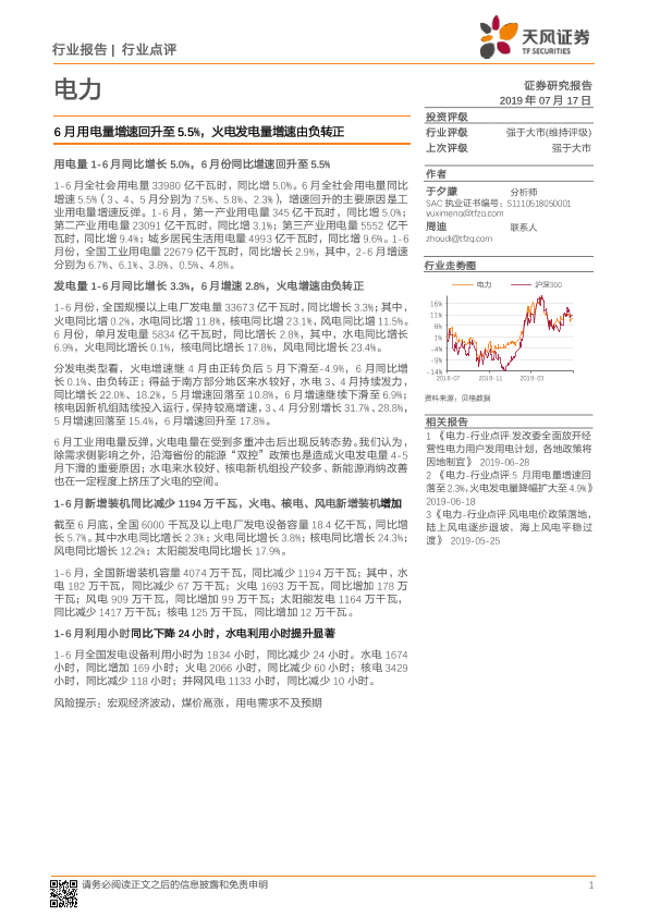 【天风证券】【20190717】6月用电量增速回升至5.5%,火电发电量增速由负转正-10页