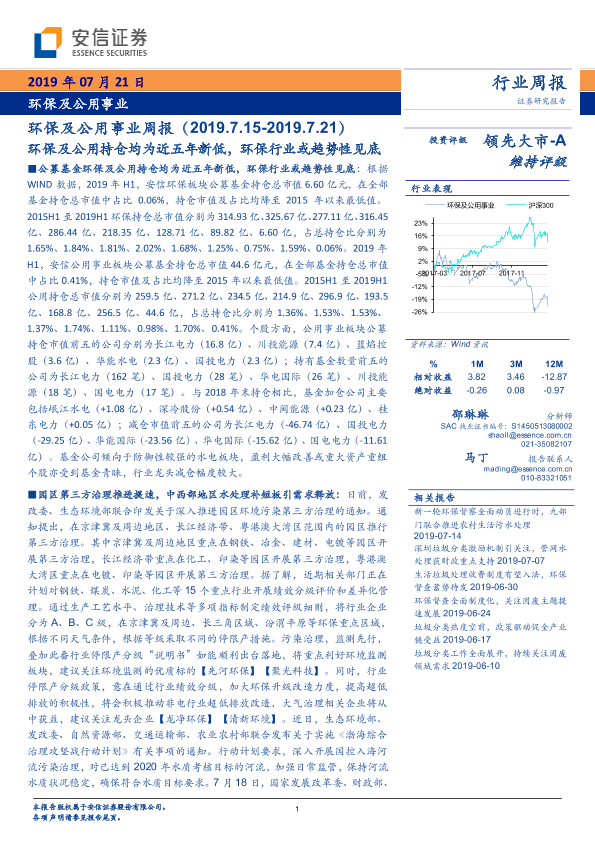 【安信证券】【20190721】环保及公用事业周报:环保及公用持仓均为近五年新低,环保行业或趋势性见底-23页