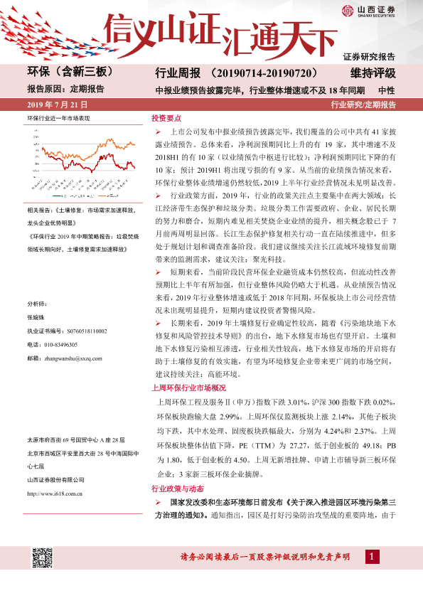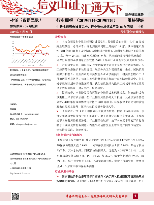 【山西证券】【20190721】环保(含新三板)行业周报:中报业绩预告披露完毕,行业整体增速或不及18年同期-11页