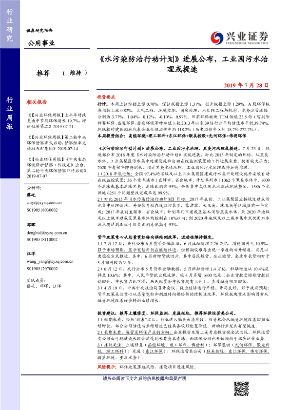 【兴业证券】【20190728】《水污染防治行动计划》进展公布,工业园污水治理或提速-10页