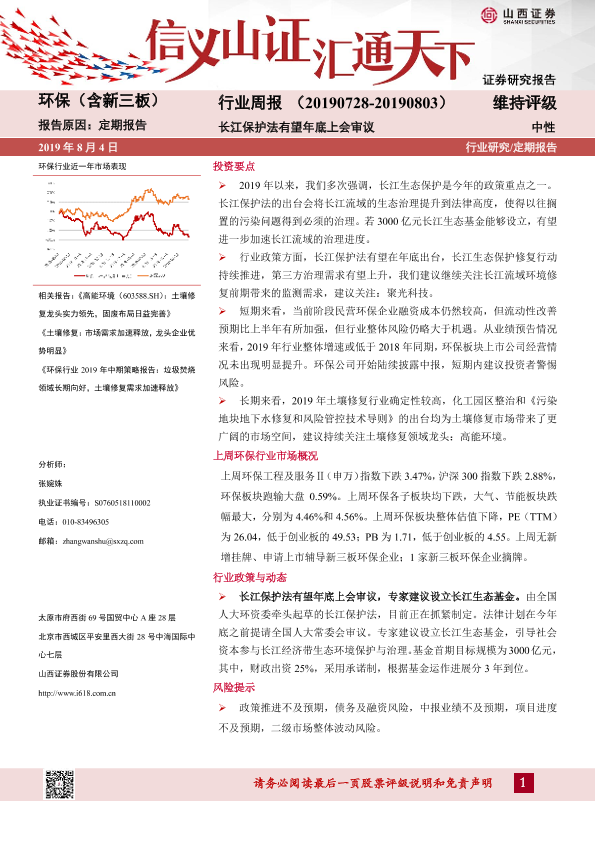 【山西证券】【20190804】环保(含新三板)行业周报:长江保护法有望年底上会审议-10页