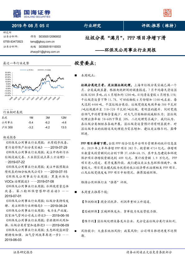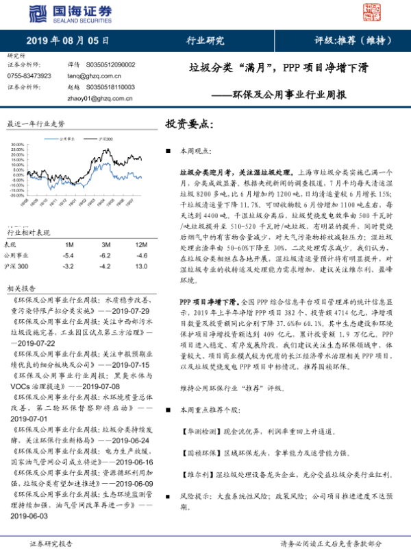 【国海证券】【20190805】环保及公用事业行业周报:垃圾分类“满月”,PPP项目净增下滑-11页