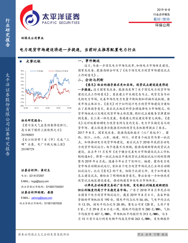 【太平洋证券】【20190808】环保及公用事业:电力现货市场建设将进一步提速,当前时点推荐配置电力行业-5页