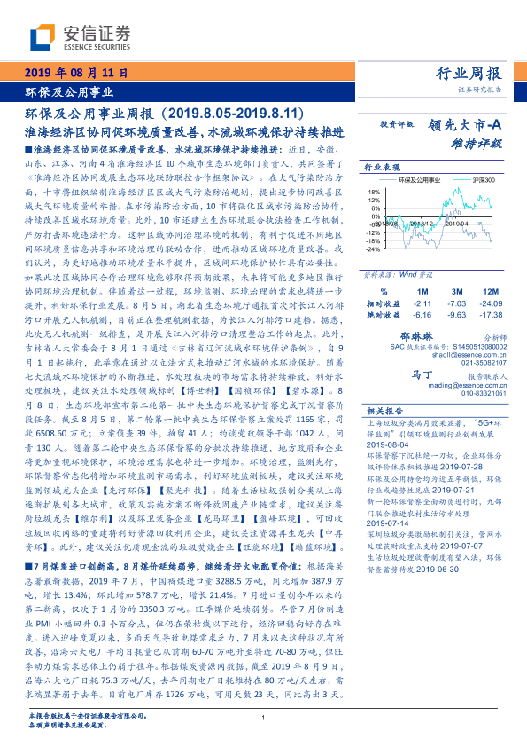 【安信证券】【20190811】环保及公用事业周报:淮海经济区协同促环境质量改善,水流域环境保护持续推进-20页