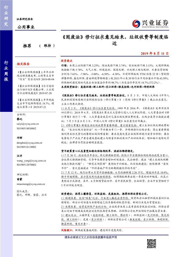 【兴业证券】【20190811】《固废法》修订征求意见结束,垃圾收费等制度临近-11页