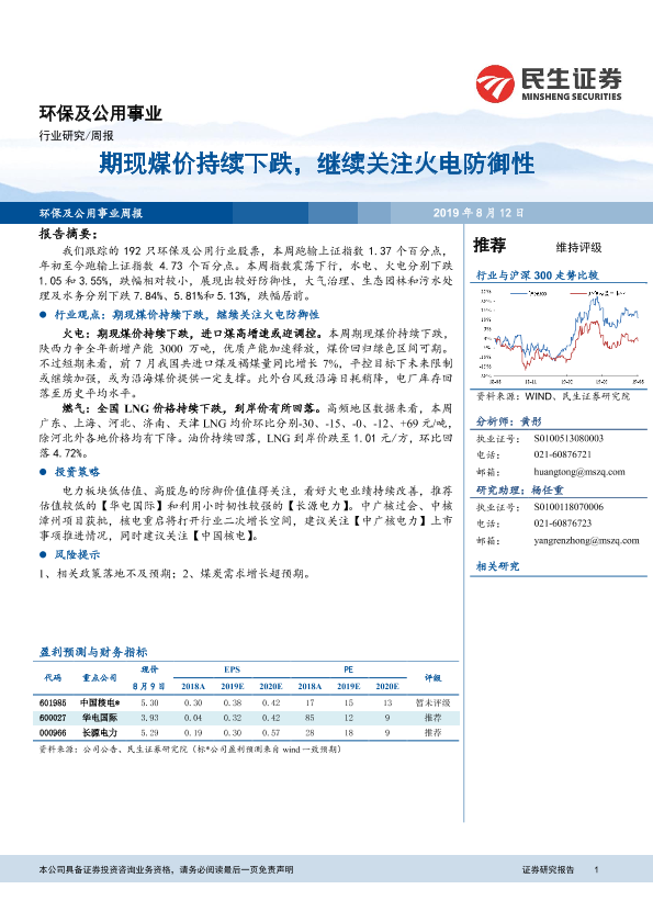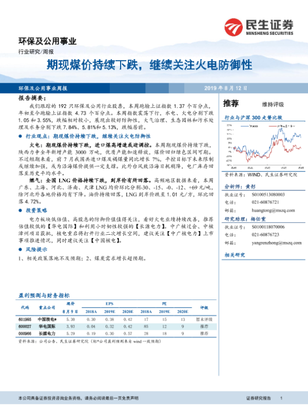 【民生证券】【20190812】环保及公用事业行业周报:期现煤价持续下跌,继续关注火电防御性-11页